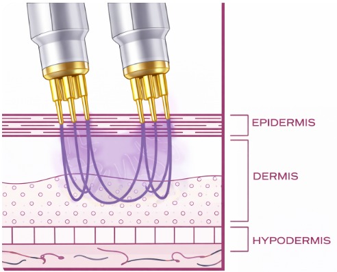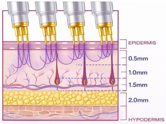 Gold-coated microneedles deliver radio frequency energy directly into the dermis, promoting controlled collagen denaturation, reorganisation, and regeneration while minimising epidermal thermal exposure.
