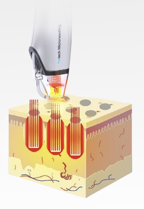 The system utilises gold-coated, insulated microneedles designed to deliver radio frequency energy exclusively at the needle tip, enabling precise dermal heating while minimising thermal impact on the epidermis.